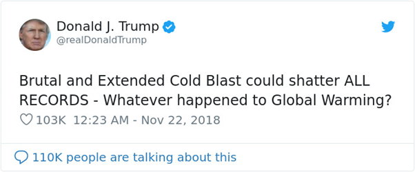 Here, in another tweet, Trump is claiming that cold weather disproves global warming.