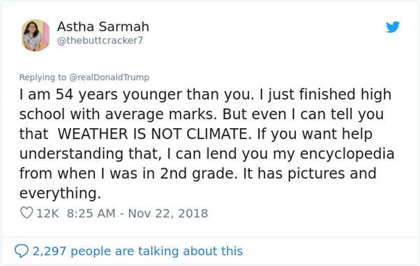 Although it is important to understand the opinions of others, I cannot understand the logic of Donald Trump. In order to try and get more people to like him, he is repeatedly saying that we don’t need to act against climate change and instead states that the money should be spent on other things. These ‘other things’ may improve people’s lives in the short term (such as giving more money to school) but he is ignoring the effects of climate change, which will effect people most severely in the future (once he is no longer president!).