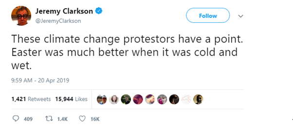 Here, Jeremy Clarkson (former Top Gear presenter) is saying that he prefers warmer, drier weather and therefore climate change is a good thing. This is another example of short-sightedness and a lack of understanding about the consequences of climate change. Climate change will warm the planet as a whole, but may actually cool the UK (due to the complicated weather patterns surrounding us). He is also ignoring other effects, such as rising sea-levels, more refugees etc. which are certainly not so positive!